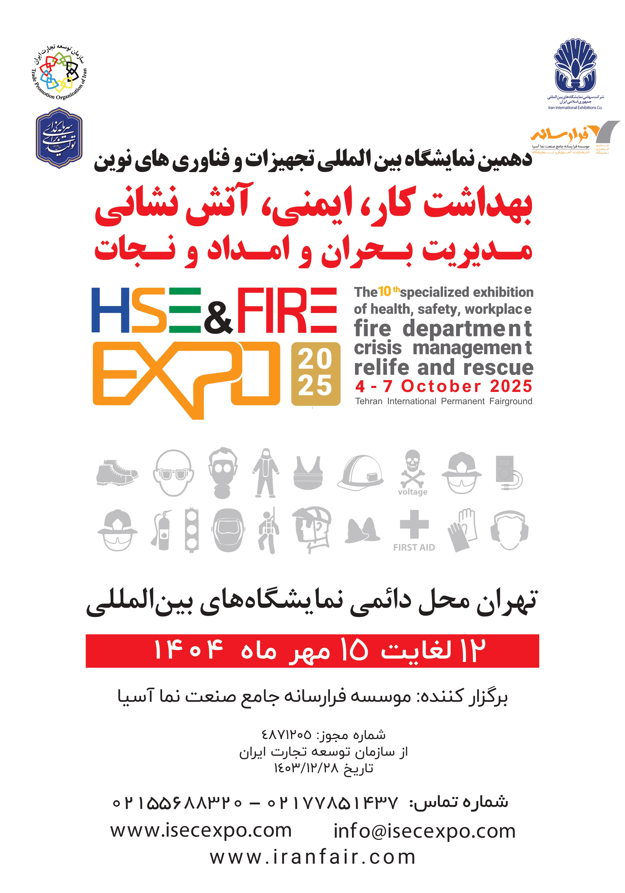 نمایشگاه بینالمللی ایمنی، آتشنشانی، مدیریت بحران و HSE بهعنوان بزرگترین رویداد تخصصی کشور در حوزه سلامت، ایمنی و محیط زیست، بستری حرفهای برای معرفی دستاوردها، تجهیزات و فناوریهای روز جهان در این صنعت به شمار میآید. این نمایشگاه با حضور گسترده شرکتها و سازمانهای فعال در زمینههای ایمنی صنعتی، تجهیزات آتشنشانی، امداد و نجات، بهداشت کار و محیط زیست، فرصتی ارزشمند برای ارتقاء سطح علمی و تبادل تجربیات میان متخصصان، پژوهشگران و صاحبان صنایع فراهم میکند. رسالت نمایشگاه: ارتقاء استانداردهای ایمنی، بهداشت شغلی و محیط زیست در صنایع کشور معرفی فناوریهای نوین و تجهیزات پیشرفته حوزه HSE ترویج و توسعه فعالیتهای پژوهشی و تحقیقاتی ایجاد بستر برای تعامل سازنده میان مدیران، متخصصان و فعالان صنعت ارائه چشماندازی نوین در عرصه سلامت و بهداشت جامعه ویژگیهای نمایشگاه: حمایت وزارتخانهها، سازمانها و نهادهای کلیدی از جمله وزارت نفت، وزارت صنعت، سازمان حفاظت محیط زیست و سازمان آتشنشانی حضور و بازدید کارشناسان و مدیران HSE از صنایع مختلف کشور همزمانی برگزاری با سایر رویدادهای صنعتی در محل دائمی نمایشگاههای تهران برای افزایش بازدیدکنندگان هزینههای مناسب برای حضور شرکتها و سازمانها برگزاری کارگاهها و سمینارهای آموزشی با همکاری مراکز دانشگاهی و پژوهشی گستردگی گروههای کالایی شامل تجهیزات ایمنی، بهداشت حرفهای، محیط زیست، آتشنشانی و امداد و نجات